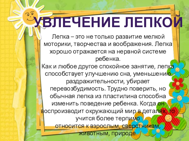 моторики, творчества и воображения. Лепка хорошо отражается на нервной системе ребенка.