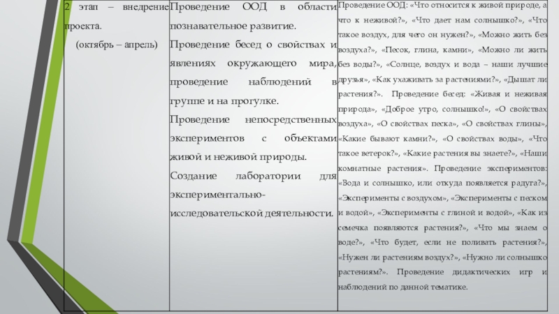 2 этап (Внедрение)- Проведение ООД в области познавательное развитие, проведение бесед о свойствах и явлениях окружающего мира, проведение наблюдений в группе и на прогулке, проведение непосредственных экспериментов с объектами живой и неживой природы, создание лаборатории для экспериментально-исследовательской деятельности.