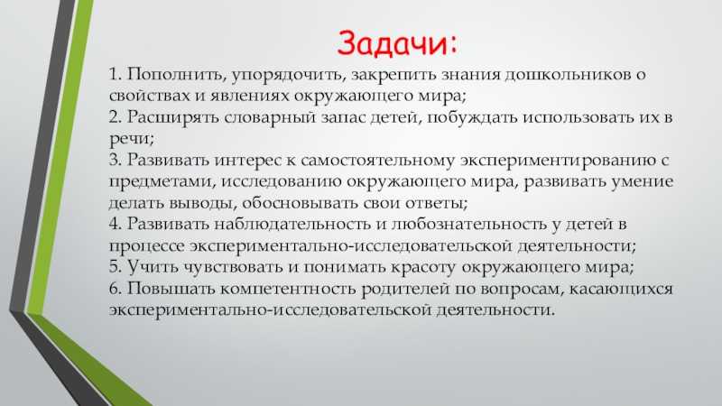 1. Пополнить, упорядочить, закрепить знания дошкольников о свойствах и явлениях окружающего