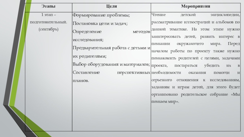 определение методов исследования, предварительная работа с детьми и их родителями, выбор оборудования и материалов, составление перспективных планов.