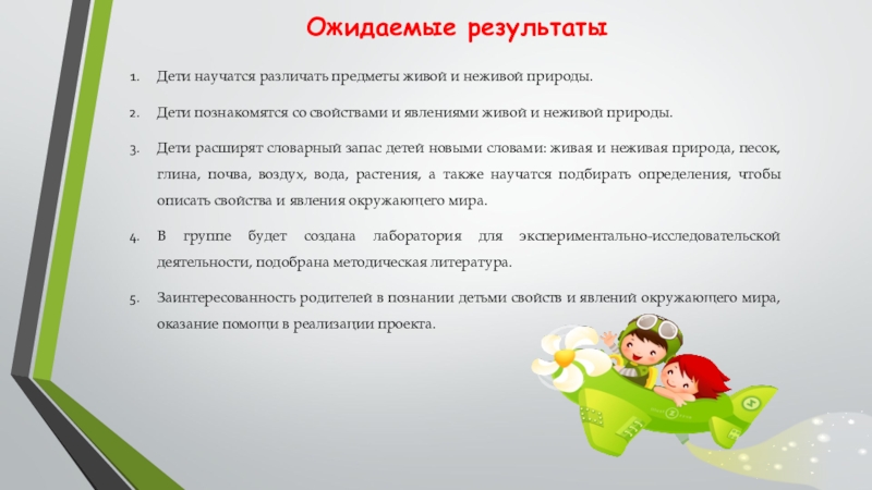 Ожидаемые результатыДети научатся различать предметы живой и неживой природы.Дети познакомятся со свойствами и явлениями живой и неживой