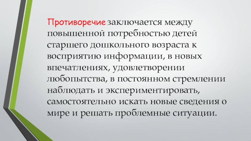 Слайд 3Противоречие заключается между повышенной потребностью детей старшего дошкольного возраста к восприятию
