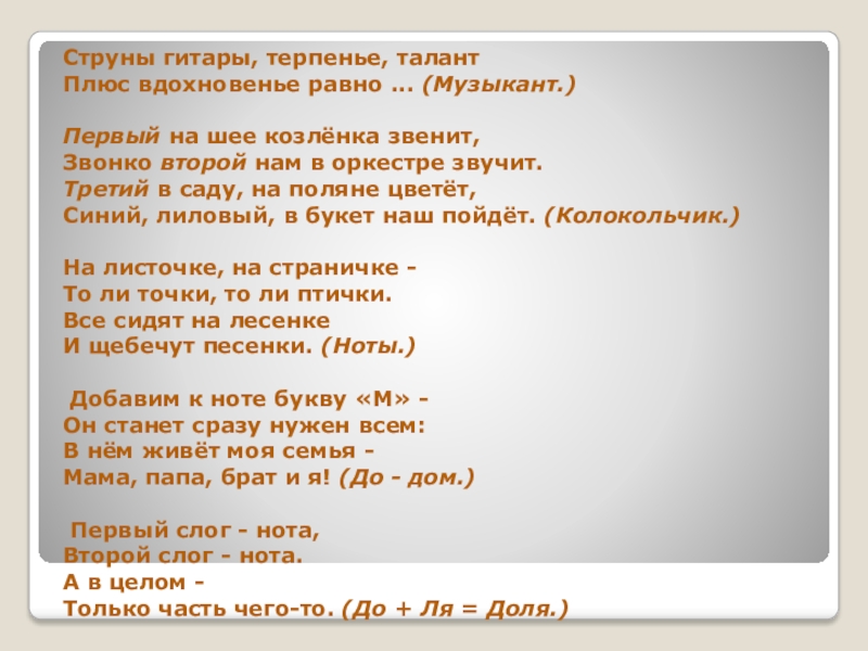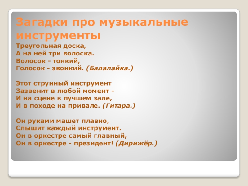 Слайд 9Загадки про музыкальные инструменты