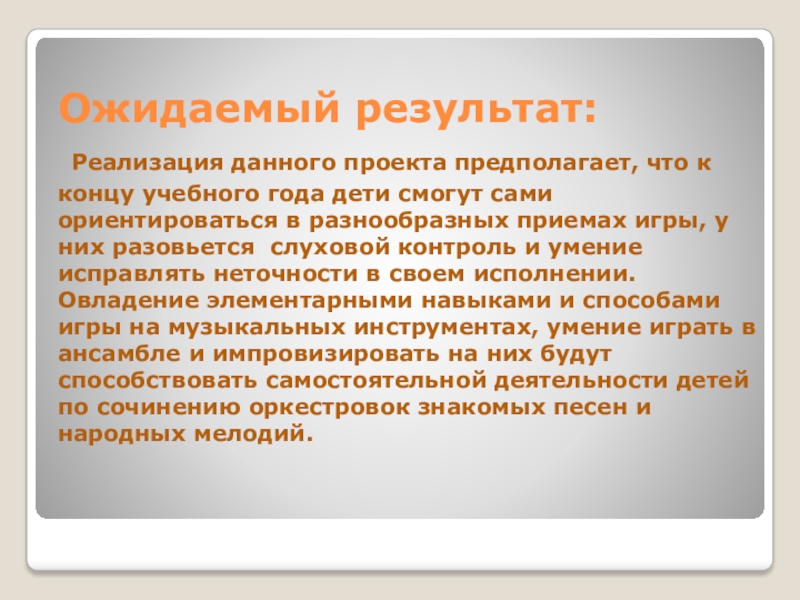 дети смогут сами ориентироваться в разнообразных приемах игры, у них разовьется слуховой контроль и умение исправлять неточности в своем исполнении. Овладение элементарными навыками и способами игры на музыкальных инструментах, умение играть в ансамбле и импровизировать на них будут способствовать самостоятельной деятельности детей по сочинению оркестровок знакомых песен и народных мелодий.