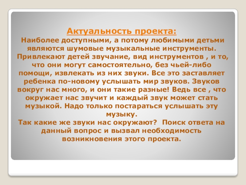 Привлекают детей звучание, вид инструментов , и то, что они могут самостоятельно, без чьей-либо помощи, извлекать из них звуки. Все это заставляет ребенка по-новому услышать мир звуков. Звуков вокруг нас много, и они такие разные! Ведь все , что окружает нас звучит и каждый звук может стать музыкой. Надо только постараться услышать эту музыку.