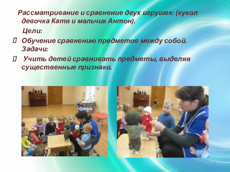 Слайд 17 Рассматривание и сравнение двух игрушек: (кукол девочка Катя и