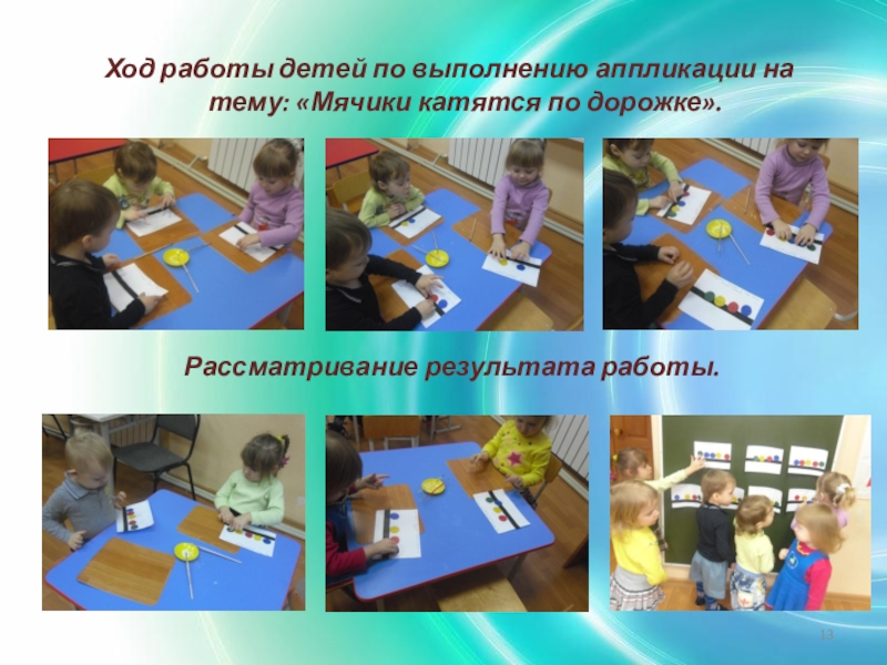Слайд 13Ход работы детей по выполнению аппликации на тему: «Мячики катятся по