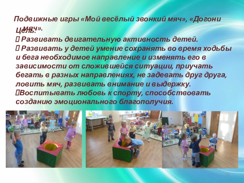 Слайд 22Подвижные игры «Мой весёлый звонкий мяч», «Догони мяч».