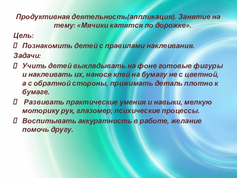 Слайд 12Продуктивная деятельность(аппликация). Занятие на тему: «Мячики катятся по дорожке».