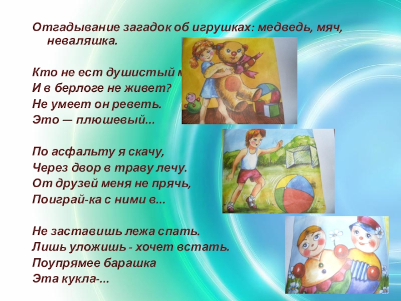 Слайд 25Отгадывание загадок об игрушках: медведь, мяч, неваляшка.
