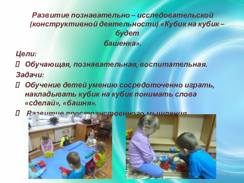Слайд 10Развитие познавательно – исследовательской (конструктивной деятельности) «Кубик на кубик – будет