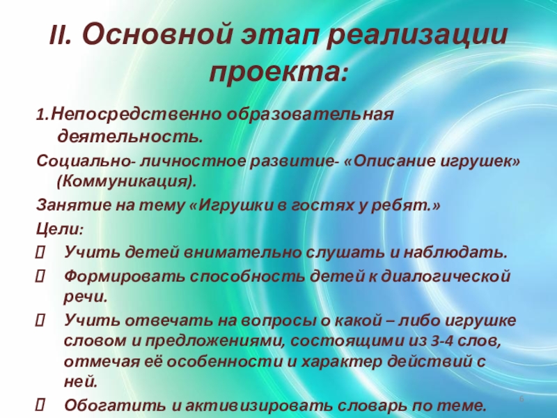 Слайд 6II. Основной этап реализации проекта: