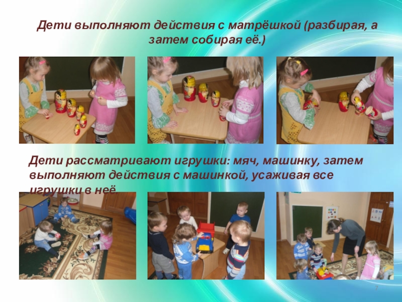 Слайд 7Дети выполняют действия с матрёшкой (разбирая, а затем собирая её.)
