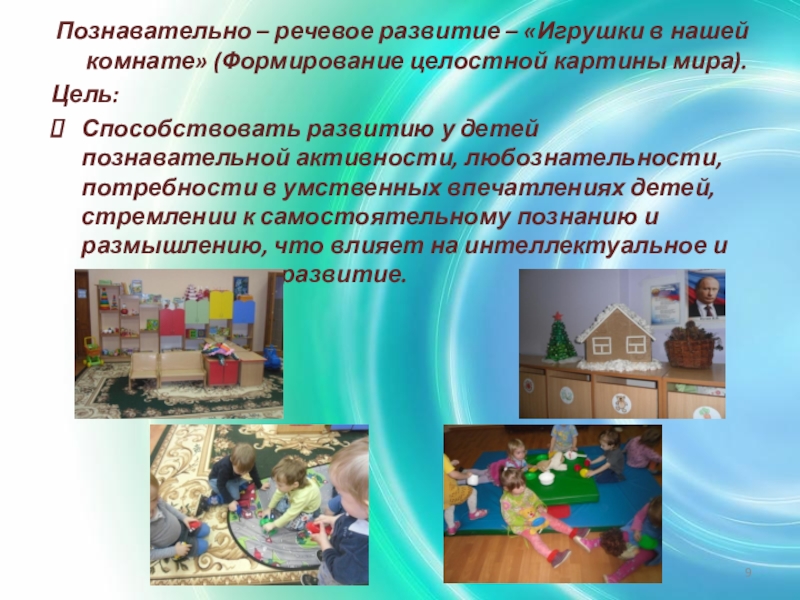 Слайд 9Познавательно – речевое развитие – «Игрушки в нашей комнате» (Формирование целостной
