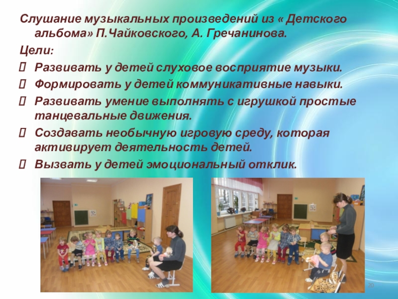 Слайд 20Слушание музыкальных произведений из « Детского альбома» П.Чайковского, А. Гречанинова.