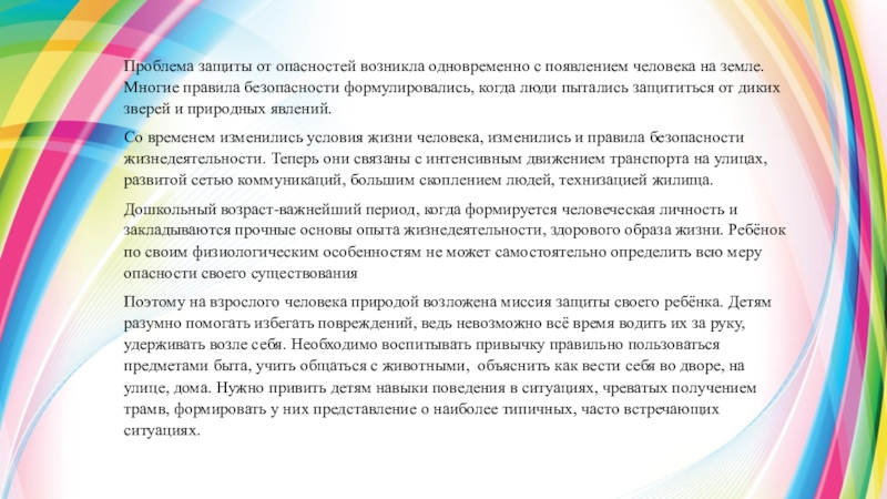 Дошкольный возраст-важнейший период, когда формируется человеческая личность и закладываются прочные основы опыта жизнедеятельности, здорового образа жизни. Ребёнок по своим физиологическим особенностям не может самостоятельно определить всю меру опасности своего существования