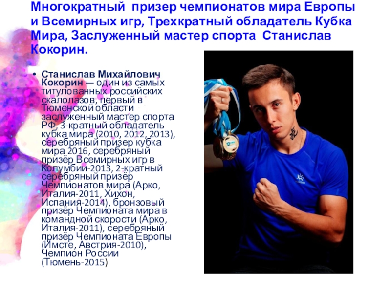 Станислав Михайлович Кокорин — один из самых титулованных российских скалолазов, первый в Тюменской области заслуженный мастер спорта РФ, 3-кратный обладатель кубка мира (2010, 2012, 2013), серебряный призер кубка мира 2016, серебряный призёр Всемирных игр в Колумбии-2013, 2-кратный серебряный призёр Чемпионатов мира (Арко, Италия-2011, Хихон, Испания-2014), бронзовый призёр Чемпионата мира в командной скорости (Арко, Италия-2011), серебряный призёр Чемпионата Европы (Имсте, Австрия-2010), Чемпион России (Тюмень-2015)