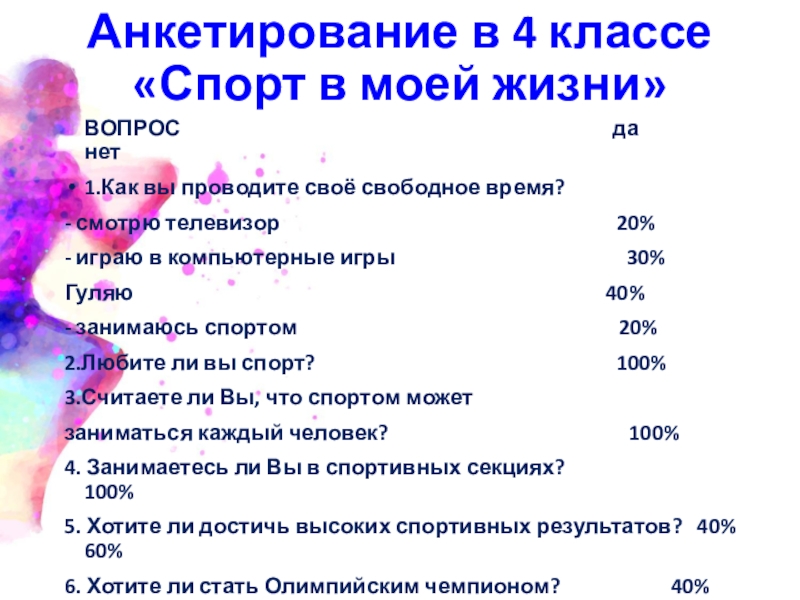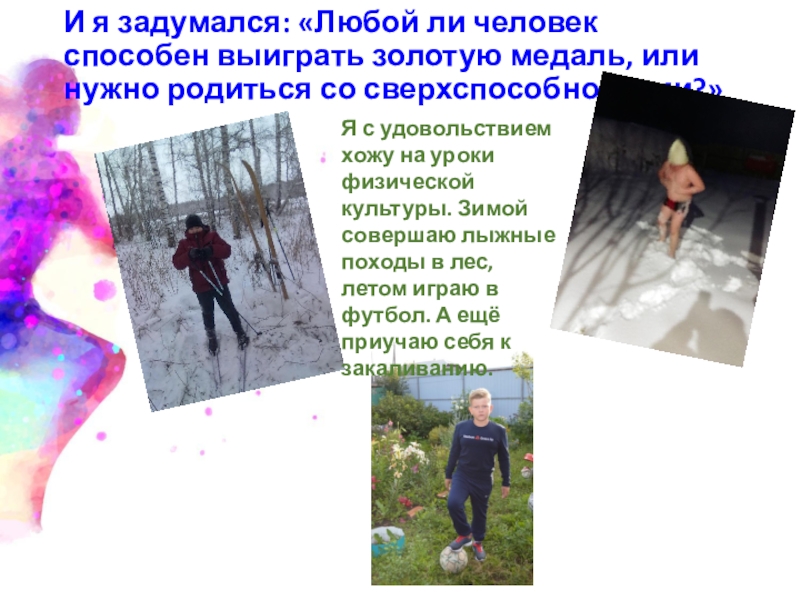 Я с удовольствием хожу на уроки физической культуры. Зимой совершаю лыжные походы в лес, летом играю в футбол. А ещё приучаю себя к закаливанию.
