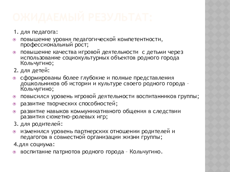 Ожидаемый результат: 1. для педагога:повышение уровня педагогической компетентности, профессиональный рост;повышение качества игровой деятельности с детьми через использование