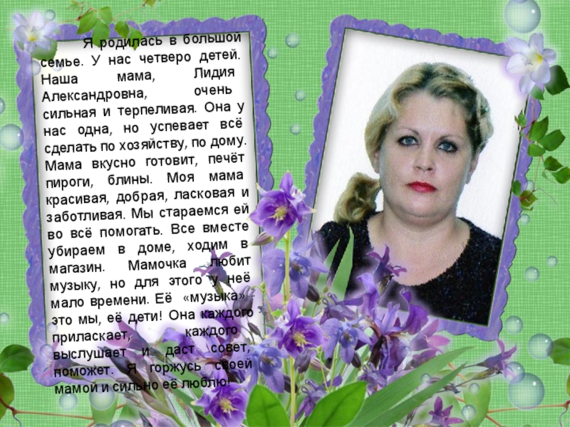 четверо детей. Наша мама, Лидия Александровна, очень сильная и терпеливая. Она у нас одна, но успевает всё сделать по хозяйству, по дому. Мама вкусно готовит, печёт пироги, блины. Моя мама красивая, добрая, ласковая и заботливая. Мы стараемся ей во всё помогать. Все вместе убираем в доме, ходим в магазин. Мамочка любит музыку, но для этого у неё мало времени. Её «музыка» - это мы, её дети! Она каждого приласкает, каждого выслушает и даст совет, поможет. Я горжусь своей мамой и сильно её люблю!