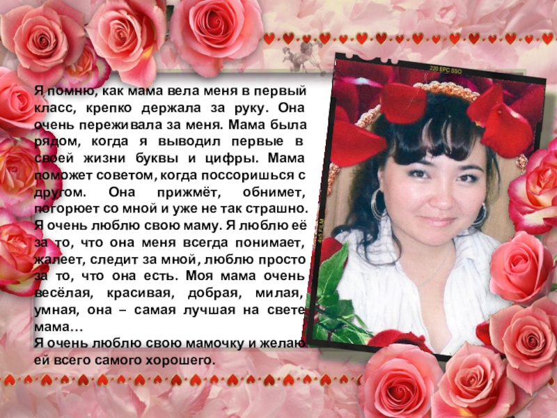за руку. Она очень переживала за меня. Мама была рядом, когда я выводил первые в своей жизни буквы и цифры. Мама поможет советом, когда поссоришься с другом. Она прижмёт, обнимет, погорюет со мной и уже не так страшно. Я очень люблю свою маму. Я люблю её за то, что она меня всегда понимает, жалеет, следит за мной, люблю просто за то, что она есть. Моя мама очень весёлая, красивая, добрая, милая, умная, она – самая лучшая на свете мама…