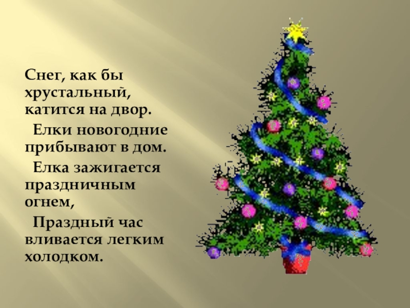 Снег, как бы хрустальный, катится на двор. Елки новогодние прибывают в дом. Елка зажигается праздничным огнем, Праздный