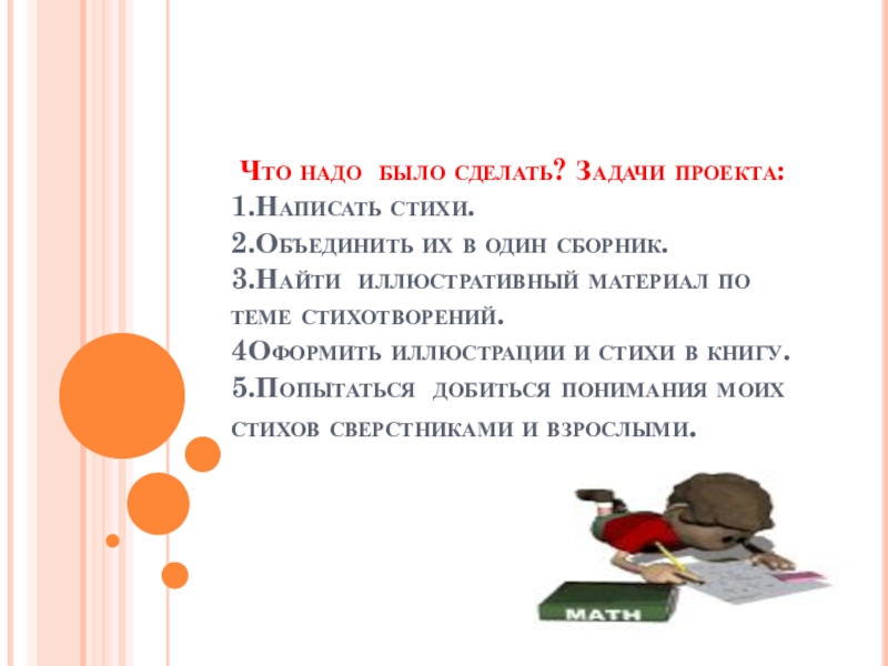 Что надо было сделать? Задачи проекта: 1.Написать стихи. 2.Объединить их в один сборник. 3.Найти иллюстративный материал