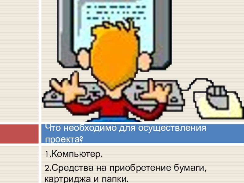 1.Компьютер.2.Средства на приобретение бумаги, картриджа и папки.Что необходимо для осуществления проекта?