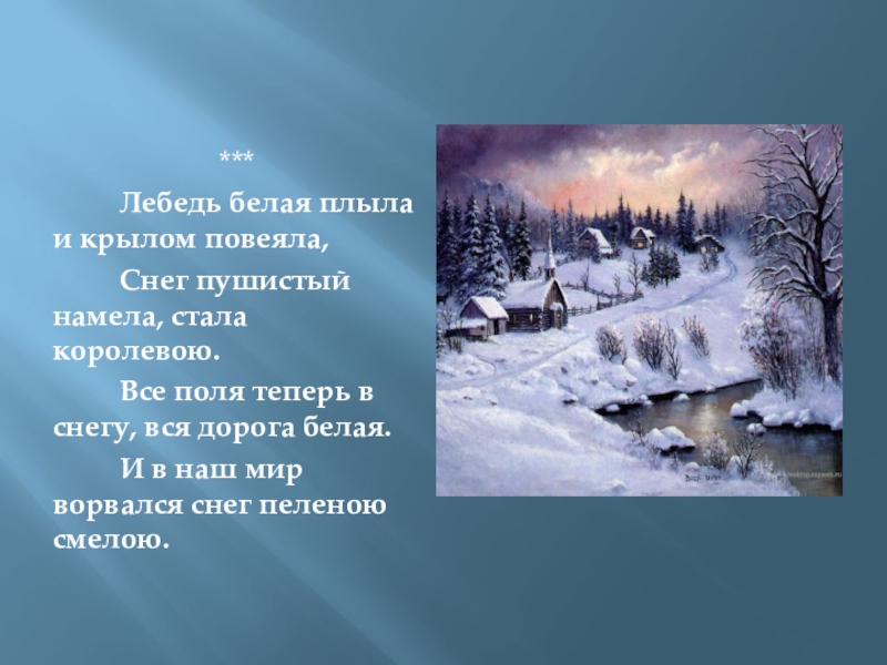 ***     Лебедь белая плыла и крылом повеяла,     Снег пушистый