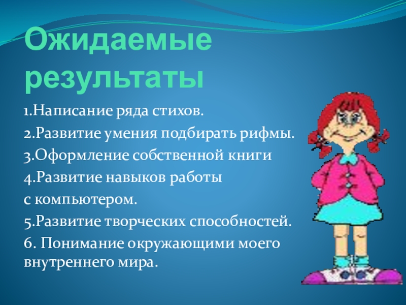 Ожидаемые результаты1.Написание ряда стихов.2.Развитие умения подбирать рифмы.3.Оформление собственной книги4.Развитие навыков работы с компьютером.5.Развитие творческих способностей.6. Понимание окружающими