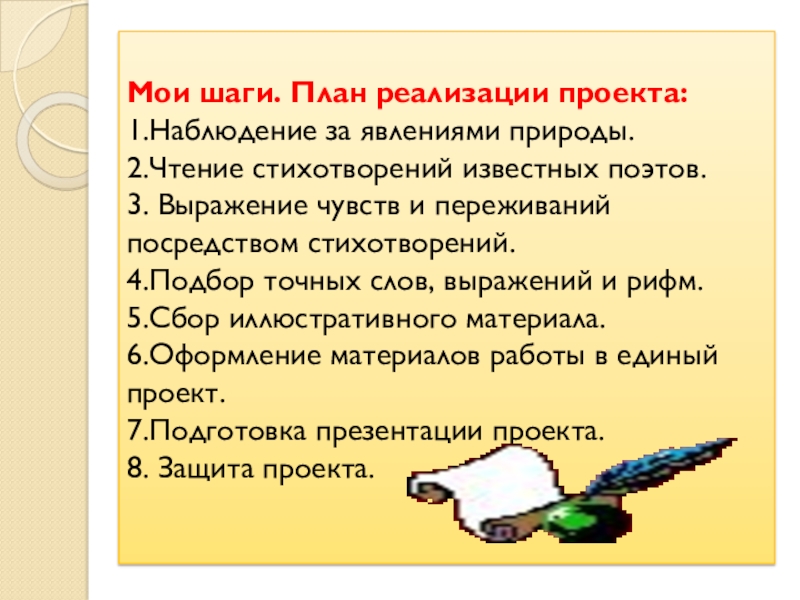 Слайд 4Мои шаги. План реализации проекта: 1.Наблюдение за явлениями природы. 2.Чтение стихотворений известных поэтов. 3.