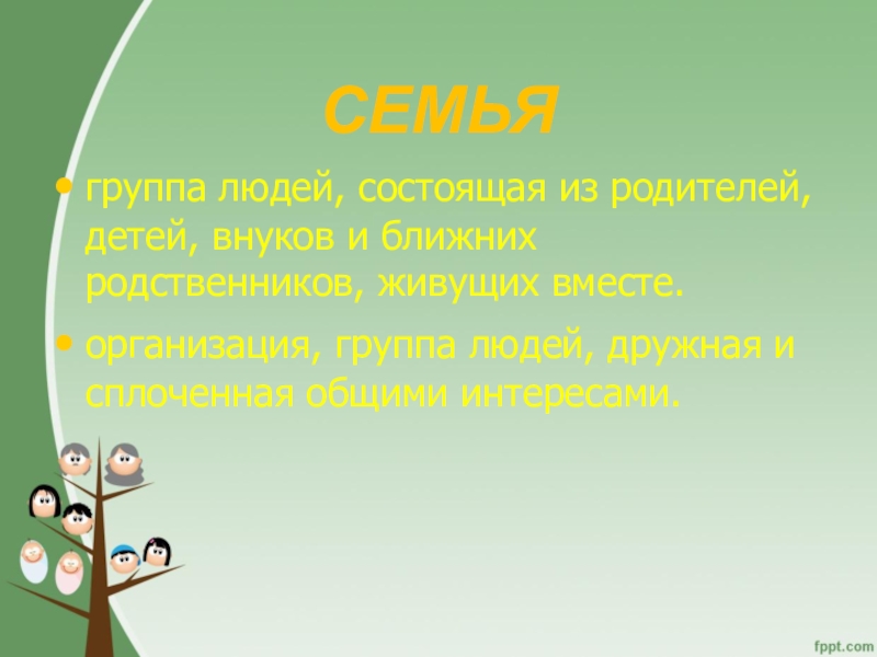 СЕМЬЯгруппа людей, состоящая из родителей, детей, внуков и ближних родственников, живущих вместе. организация, группа людей, дружная и сплоченная общими интересами.