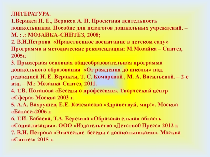1.Веракса Н. Е., Веракса А. Н. Проектная деятельность дошкольников. Пособие для