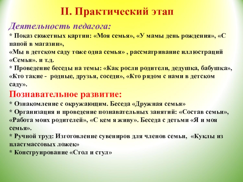 * Организация и проведение познавательных занятий: «Состав семьи», «Работа моих родителей», «С кем я живу». Беседа с детьми «Я и моя семья».