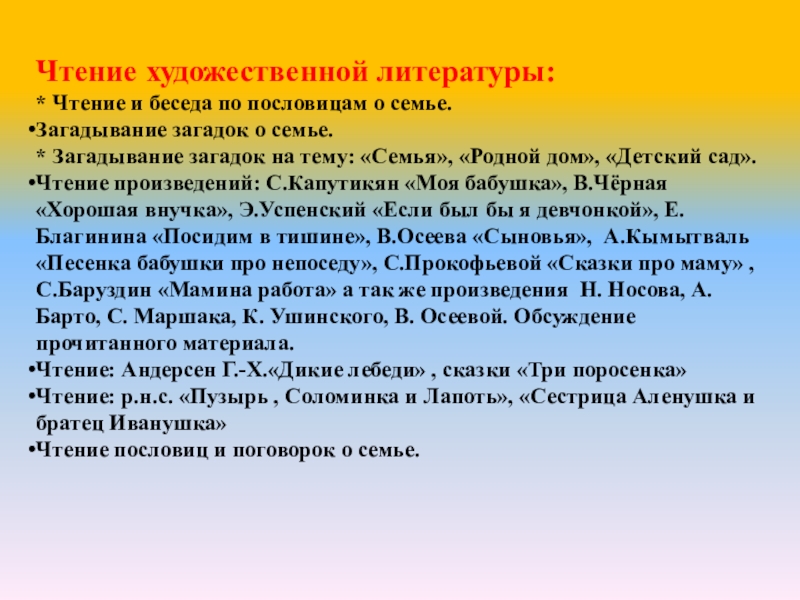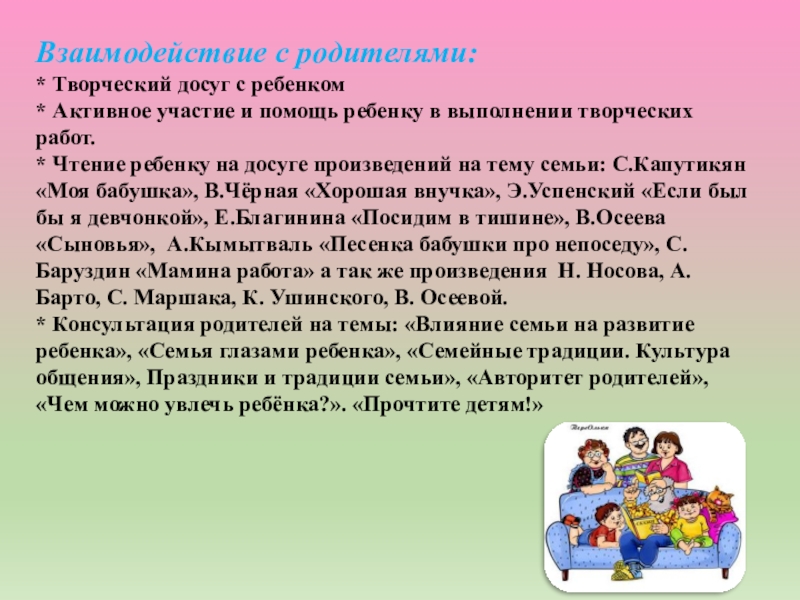 * Чтение ребенку на досуге произведений на тему семьи: С.Капутикян «Моя бабушка», В.Чёрная «Хорошая внучка», Э.Успенский «Если был бы я девчонкой», Е.Благинина «Посидим в тишине», В.Осеева «Сыновья», А.Кымытваль «Песенка бабушки про непоседу», С.Баруздин «Мамина работа» а так же произведения Н. Носова, А. Барто, С. Маршака, К. Ушинского, В. Осеевой.