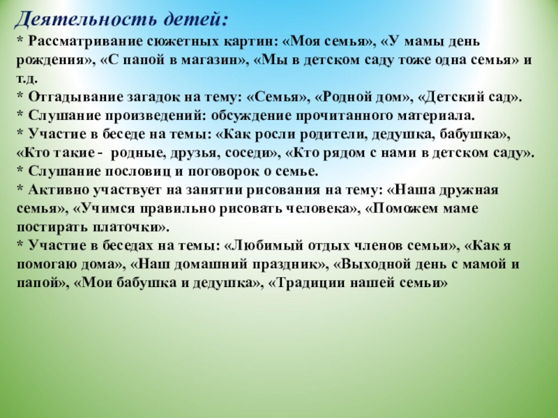 * Загадывание загадок на тему: «Семья», «Родной дом», «Детский сад».