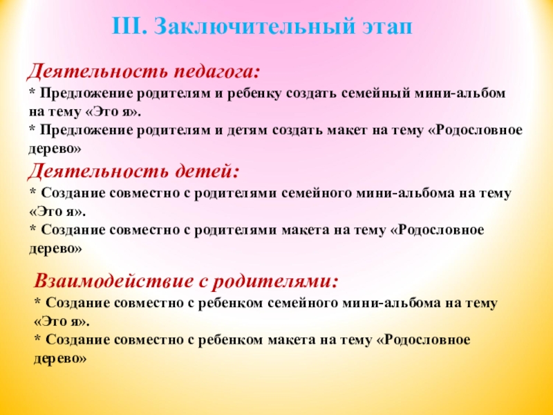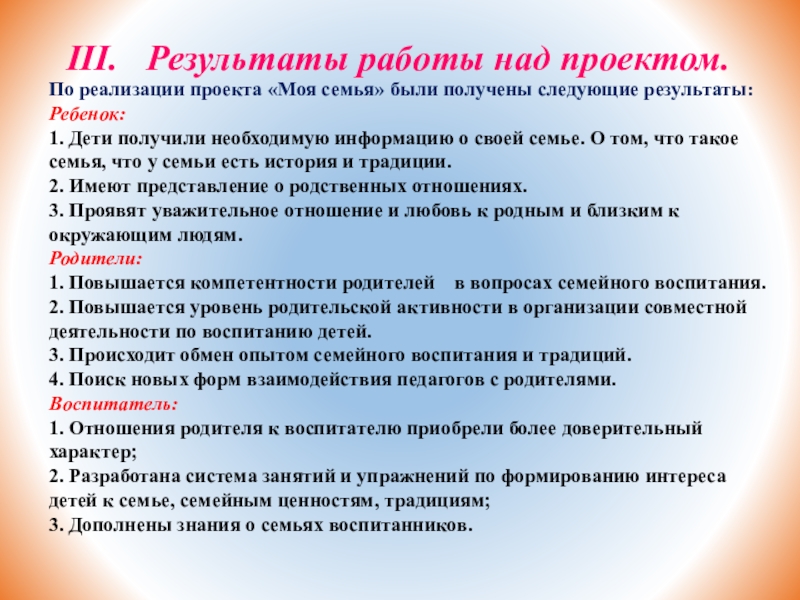 1. Дети получили необходимую информацию о своей семье. О том, что такое семья, что у семьи есть история и традиции.