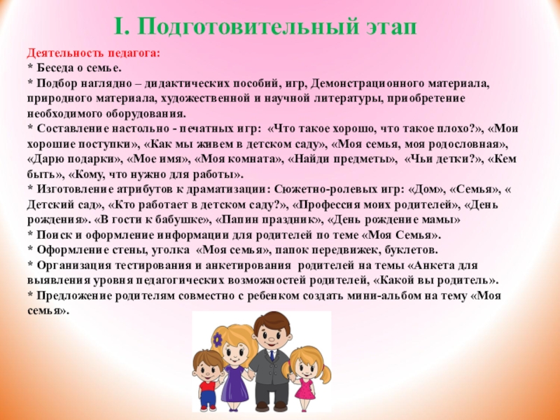 информационного материала, создание условий для организации работы в «Моя семья», составление плана мероприятий по организации детской деятельности – 1-й месяц.