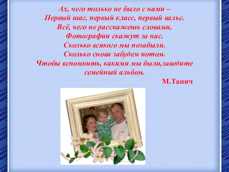 о том, что объединяет всех нас - о семье. У каждого человека есть своя семья, свой дом. И где бы ни были, мы всегда помним о нем, он притягивает нас своим теплом. Дом – это не только крыша над головой, это твоя семья и близкие тебе люди: родители, сестры, братья, бабушки, дедушки.