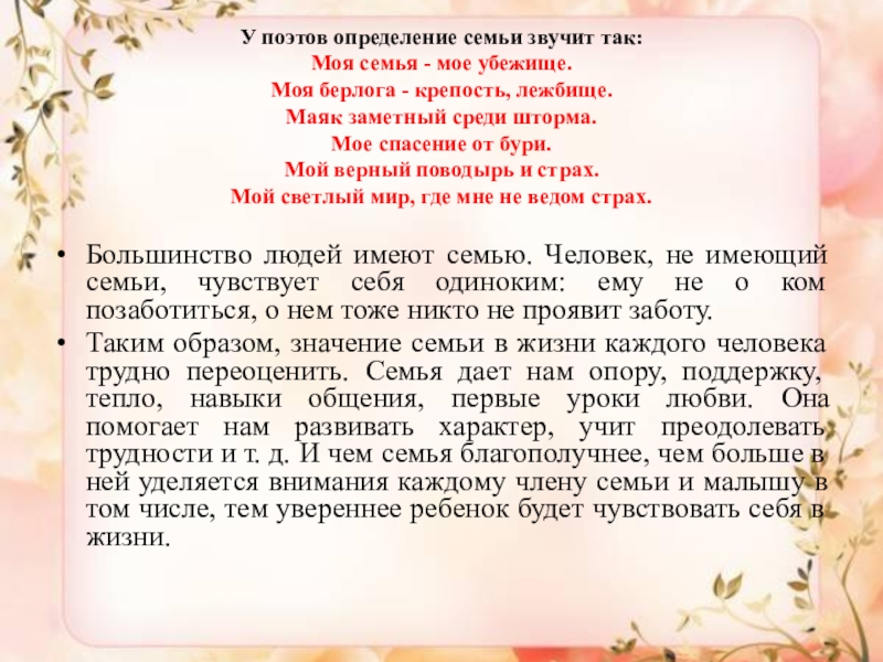 Но семья не сможет хорошо заботиться о детях, сохранять доброжелательную, благоприятную для воспитания атмосферу, если у нее не будет всего, что нужно для нормальной жизни. Поэтому взрослые члены семьи работают. Но трудятся они не только ради себя и своей семьи. На работе они делают то, что нужно и другим людям. Значит, семья еще и трудовая ячейка общества, она вносит большой вклад в его благополучие. И наконец, семья испокон веков считалась хранительницей домашнего очага, здорового образа жизни. В кругу родных вы находите то тепло человеческих отношений, взаимопонимание и сочувствие, которые не всегда можно найти даже среди близких друзей.