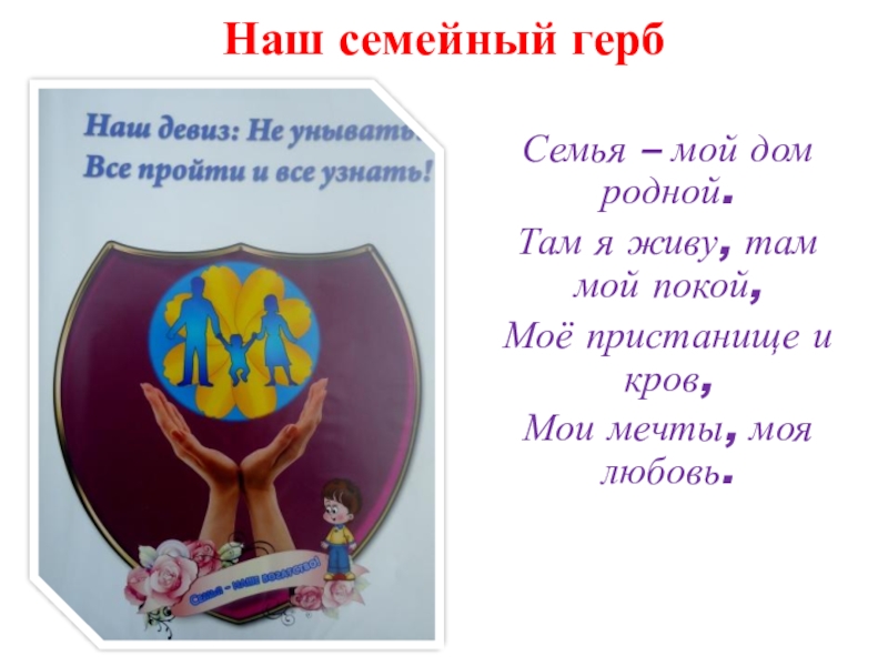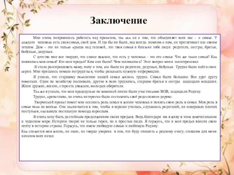 Творческий проект помог мне осознать роль семьи в жизни человека и понять свою роль в семье. Моя роль в семье пока не велика. Она заключается в том, чтобы я хорошо училась, слушалась родителей, не совершала плохих поступков, оказывала посильную помощь взрослым.