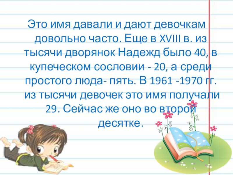 в. из тысячи дворянок Надежд было 40, в купеческом сословии - 20, а среди простого люда- пять. В 1961 -1970 гг. из тысячи девочек это имя получали 29. Сейчас же оно во второй десятке.