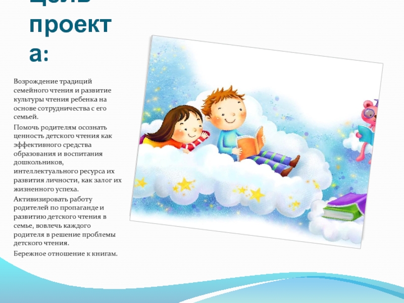 Цель проекта:Возрождение традиций семейного чтения и развитие культуры чтения ребенка на основе сотрудничества с его семьей.Помочь родителям