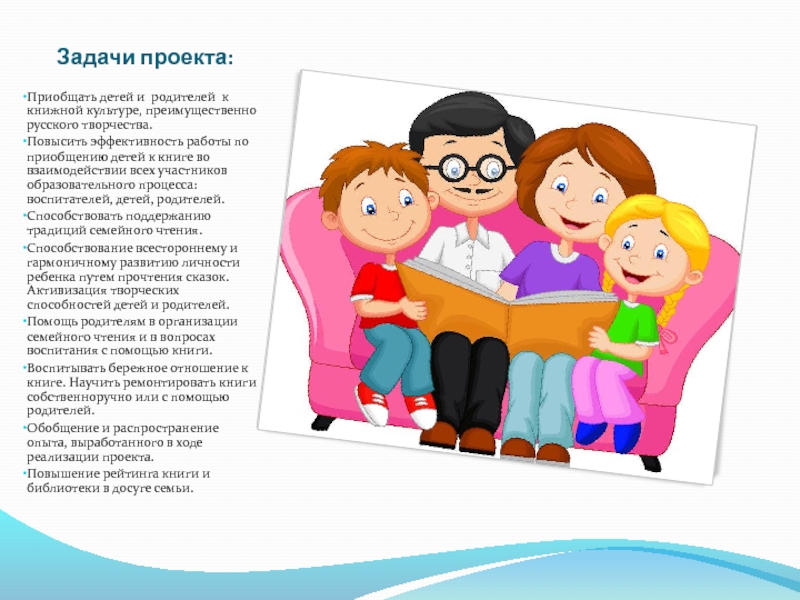 Задачи проекта:Приобщать детей и  родителей  к книжной культуре, преимущественно русского творчества.Повысить эффективность работы по приобщению детей к