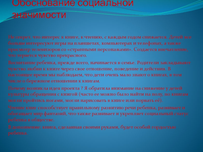Обоснование социальной значимости Не секрет, что интерес к книге, к чтению, с каждым годом снижается. Детей все