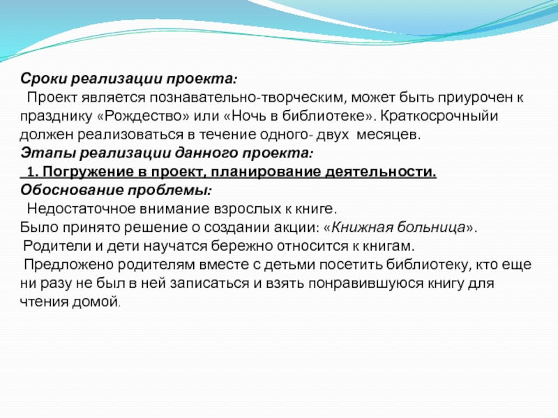 «Рождество» или «Ночь в библиотеке». Краткосрочныйи должен реализоваться в течение одного- двух месяцев. Этапы реализации данного проекта: 1. Погружение в проект, планирование деятельности. Обоснование проблемы:  Недостаточное внимание взрослых к книге. Было принято решение о создании акции: «Книжная больница». Родители и дети научатся бережно относится к книгам. Предложено родителям вместе с детьми посетить библиотеку, кто еще ни разу не был в ней записаться и взять понравившуюся книгу для чтения домой.