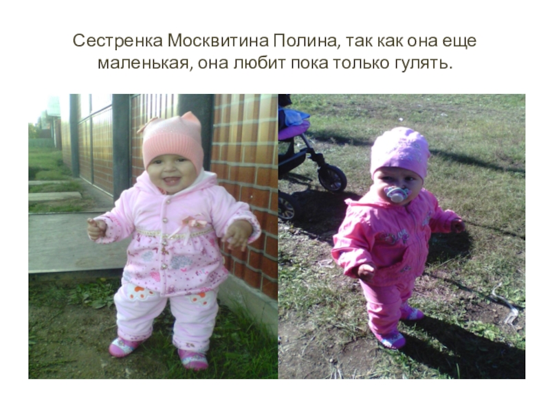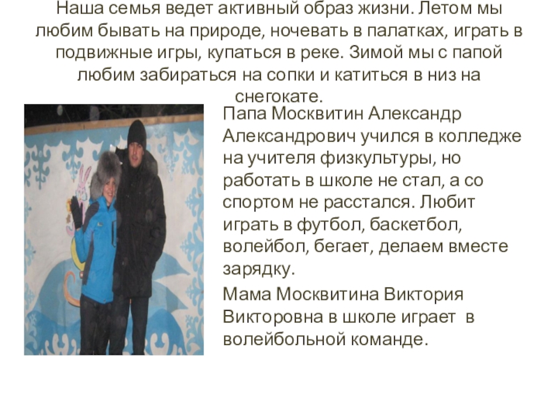 Папа Москвитин Александр Александрович учился в колледже на учителя физкультуры, но работать в школе не стал, а со спортом не расстался. Любит играть в футбол, баскетбол, волейбол, бегает, делаем вместе зарядку.