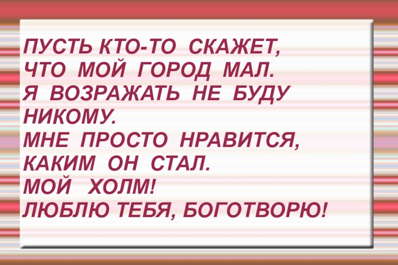 Слайд 35ПУСТЬ КТО-ТО СКАЖЕТ, ЧТО МОЙ ГОРОД МАЛ. Я ВОЗРАЖАТЬ НЕ БУДУ НИКОМУ. МНЕ ПРОСТО