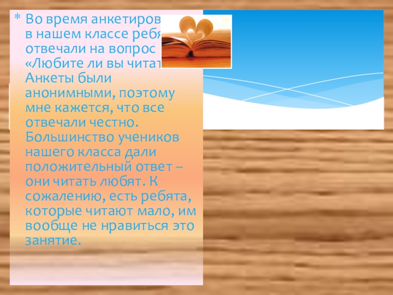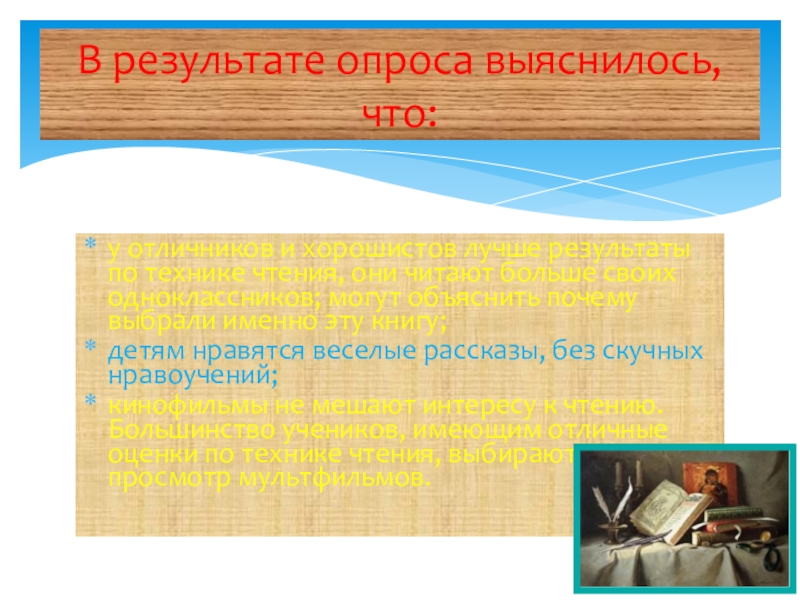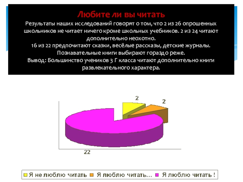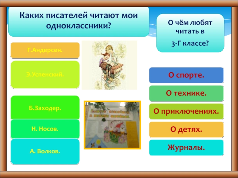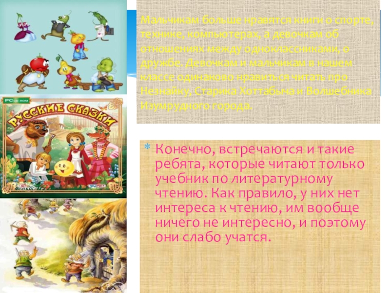 Мальчикам больше нравятся книги о спорте, технике, компьютерах, а девочкам об отношениях между одноклассниками, о дружбе. Девочкам и мальчикам в нашем классе одинаково нравиться читать про Незнайку, Старика Хоттабыча и Волшебника Изумрудного города.