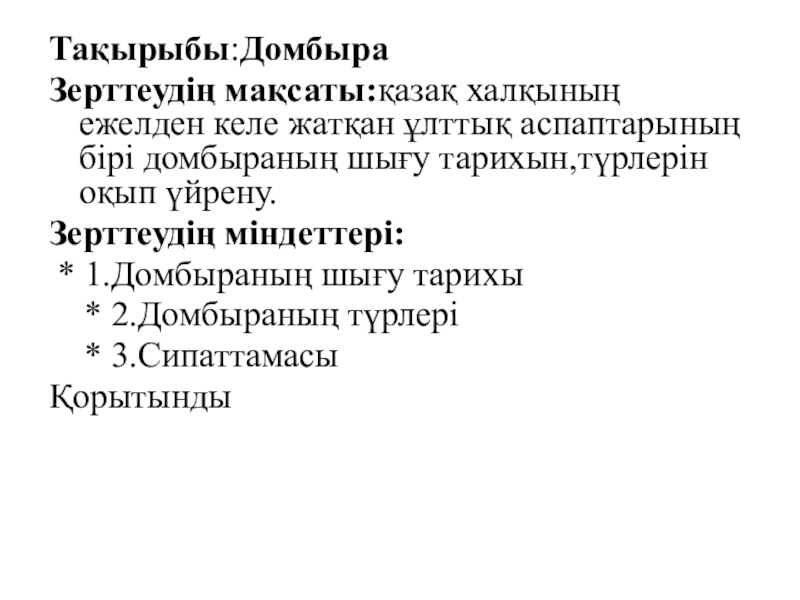 Зерттеудің мақсаты:қазақ халқының ежелден келе жатқан ұлттық аспаптарының бірі домбыраның шығу